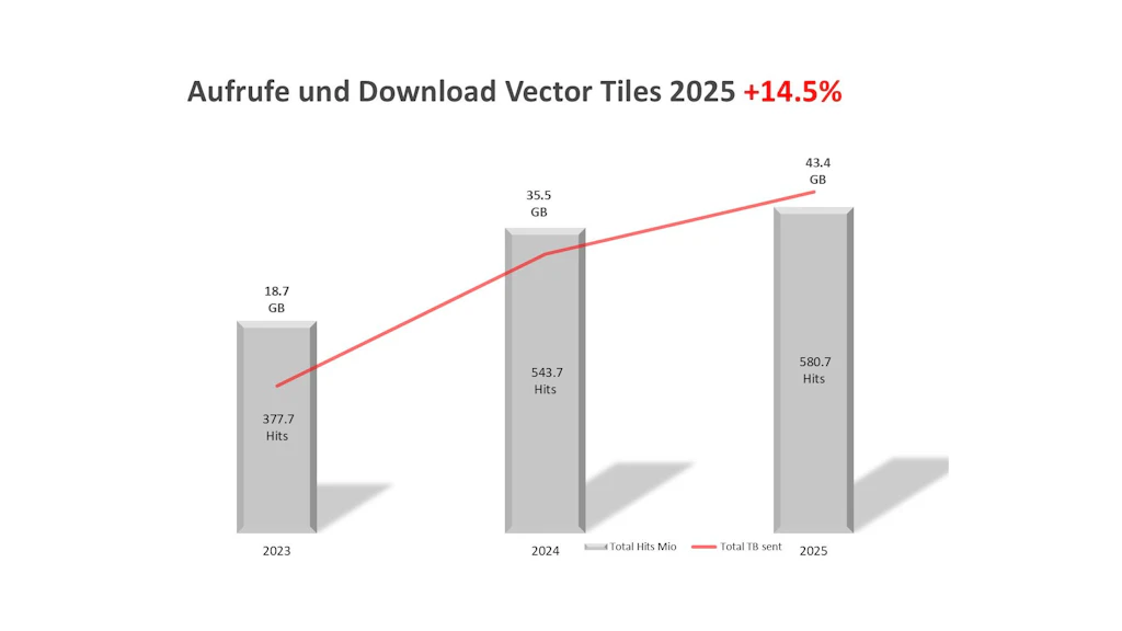 Ein zentraler Treiber der Entwicklung ist die Nutzung durch externe Web- und App-Anbieter, die die Geodaten durch Geodienste in eigene Anwendungen integrieren. Sei es bei den sehr populären Darstellungsdiensten WM(T)S, deren Nutzung nur innerhalb eines Jahres um über 25% gestiegen ist, oder bei den immer beliebteren Vector Tiles – Webservices zeichnen sich durch kontinuierliches Wachstum aus.