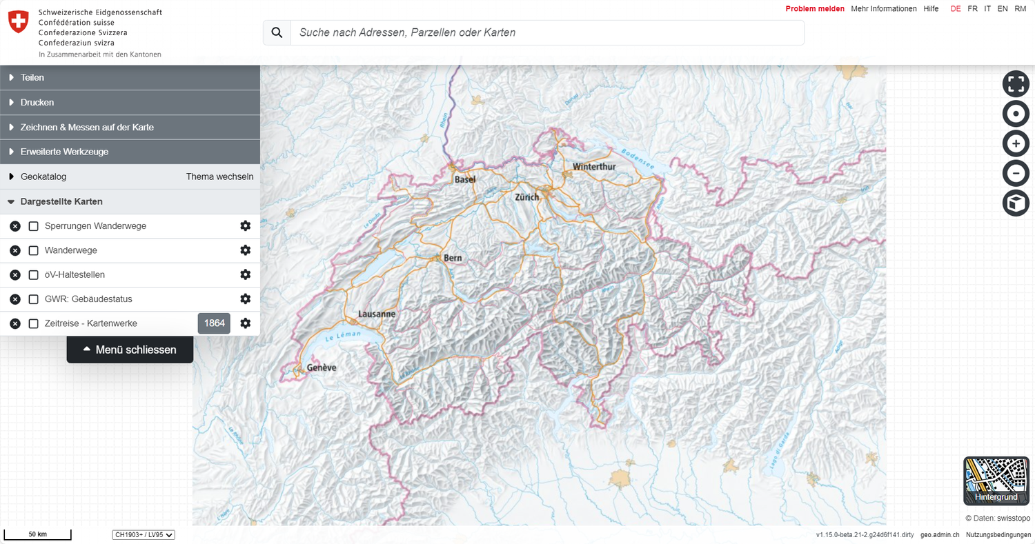 Der neue Kartenviewer kann bereits seit mehreren Monaten auf test.map.geo.admin.ch getestet werden. Dieses Angebot wurde intensiv genutzt und dafür möchte sich das Geoportal-Team bei allen Nutzenden bedanken. Die eingegangenen hilfreichen Rückmeldungen lieferten wichtige Hinweise für die Erneuerung des Kartenviewers.