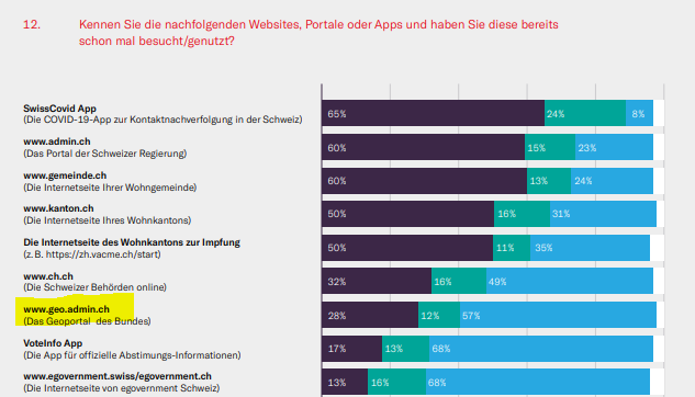 Gemäss der «Nationalen E-Government Studie 2022» *) ist geo.admin.ch Spitzenreiter bei den E-Services : Rund 40% der Schweizer Bevölkerung kennen das Geoportal des Bundes.