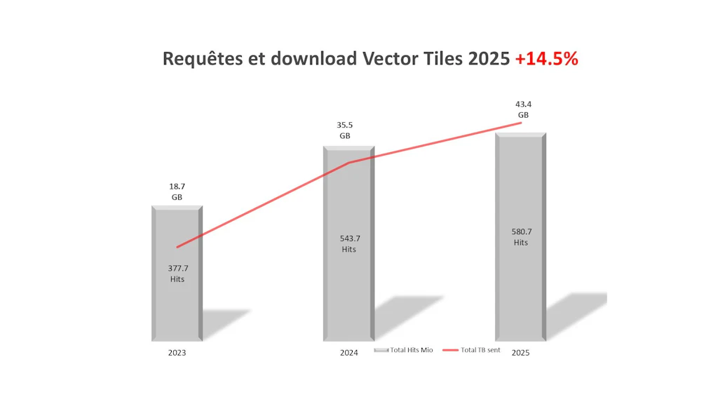 L'un des principaux moteurs de cette évolution est l'utilisation par des développeurs externes de sites web et d'applications, qui intègrent les géodonnées dans leurs propres applications via des géoservices. Qu'il s'agisse des services de visualisation très populaires WM(T)S, dont l'utilisation a augmenté de plus de 25 % en un an seulement, ou des Vector Tiles, qui connaissent un succès croissant, les services web se caractérisent par une croissance continue.