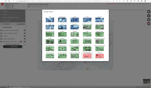 De plus, il existe désormais un nouveau thème « Géoressources ». Ce dernier comprend les catégories « Géo-énergie », « Matières premières minérales », « eaux souterraines », « espace souterrain » et « données de base ».