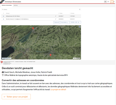 Le projet « Les Géodonnées, c'est facile » sert à convertir facilement des adresses en coordonnées ( https://swisstopo-showcases.netlify.app/address-to-coordinate ). Si le projet gagne, il recevra une contribution de soutien de 30 000 CHF pour la mise en œuvre d’un prototype fonctionnel.
