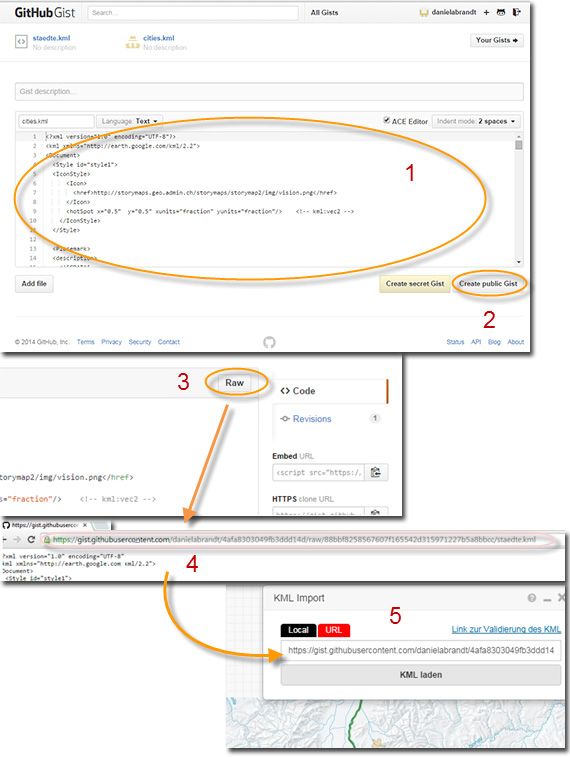- Creare l'URL trascinando e rilasciando il file KML/GPX nella finestra di testo di Gist (1).